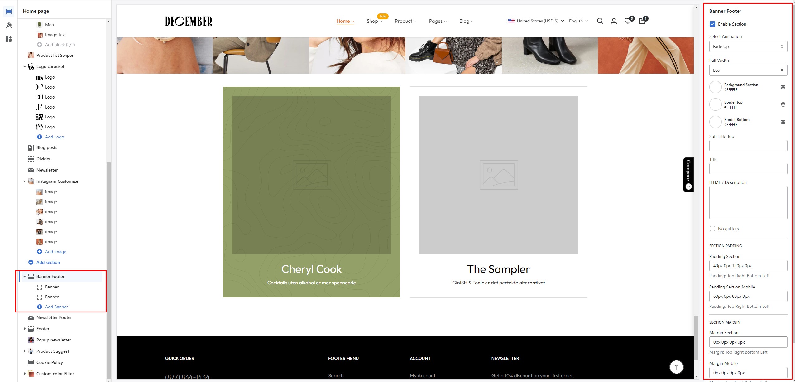 In the theme editor **(Customize) => Section**, click **Banner Footer**
