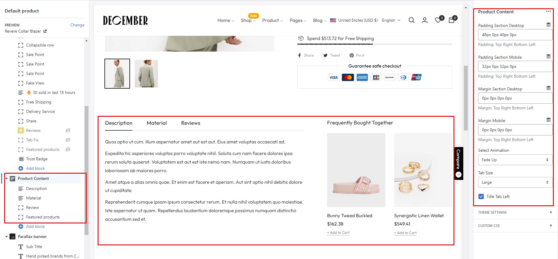 In the theme editor (**Customize**) **Default product** > Click  **Product Content**